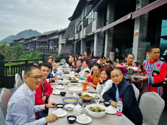 一邊品嘗著誘人的土家長桌美食