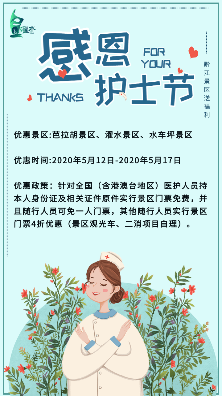 正值國際護士節之際,為感恩全國醫護人員,黔江旅游在2020年5月12日-2020年5月17日開展景區門票優惠促銷活動: