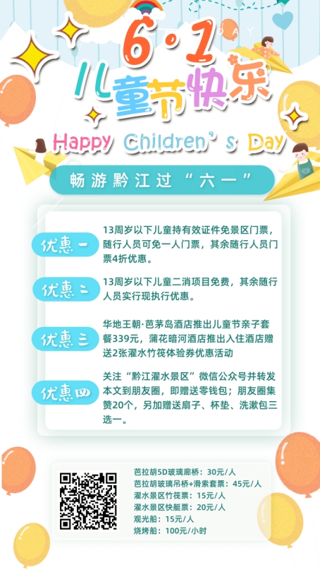 一年一度的6·1兒童節即將到來,大朋友們想好帶孩子去哪里玩了嗎?只要帶著一顆童心,歡樂也能提前預定!黔江濯水景區祝小朋友們節日快樂!5月30日至6月1日,黔江旅游景區兒童節超好玩,優惠享不停,歡樂過六一!